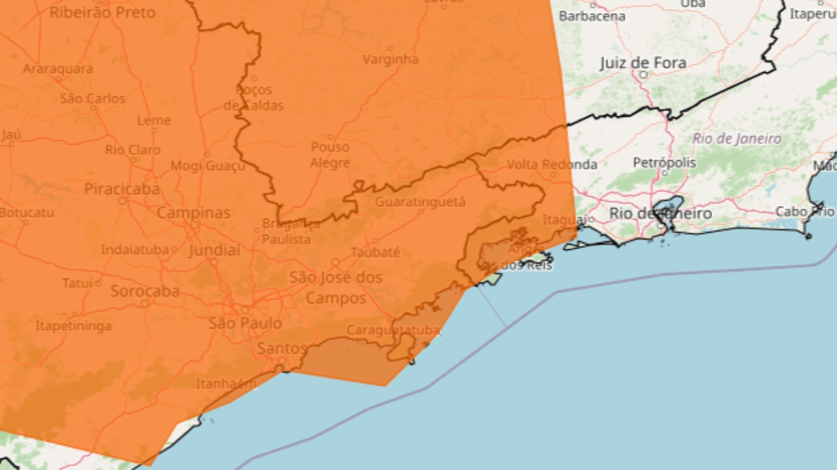 No mapa divulgado pelo INMET, cidades do Vale do Paraíba e do Litoral Norte aparecem na área destacada em laranja, classificação que indica grau de atenção para possibilidade de tempestades e acumulados elevados de chuva.
